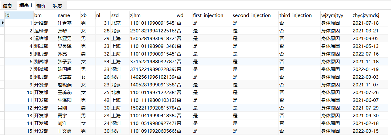 一張技術中心的新冠疫苗接種信息表,表結構和數據如下,用于我們練習各種類型的查詢語句。