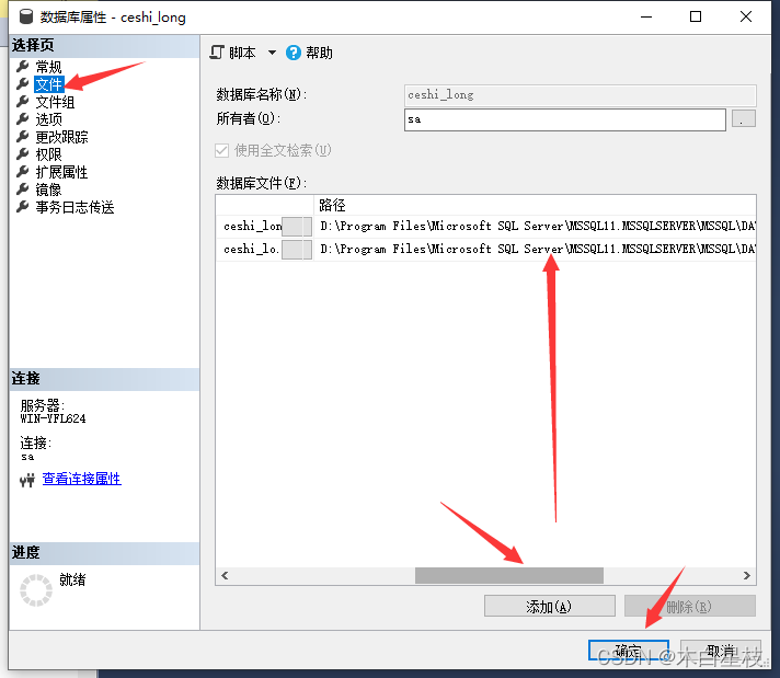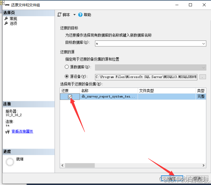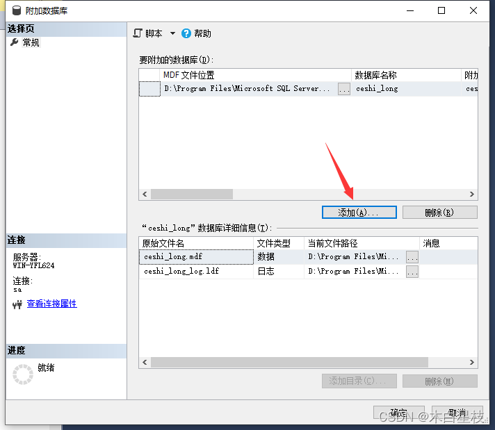 然后設置目標數據庫的名字,如果數據庫中已經存在相同名字的,則需要修改或者刪除原來同名的數據庫,然后在選擇源設備,點擊右邊的。。。點擊彈出框中的添加,找到要備份文件的位置,點擊確定。