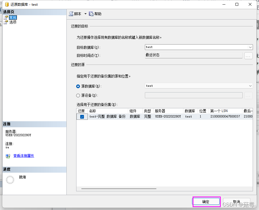 在常規,使用源部分指定要還原的備份集和位置;在目標部分,數據庫文本框自動填充要還原的數據庫的名稱;