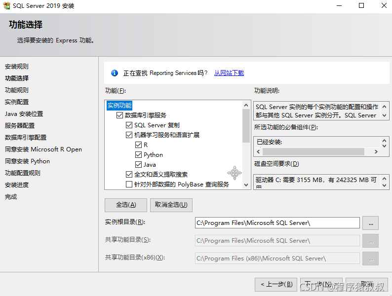 第七步:選擇你要安裝的實例功能,如果不知道選擇什么的,通常全選,如果清楚的,根據需求去選擇,同時也要看一下你的盤符大小是否足夠安裝你的程序,實例目錄我們使用默認就行。