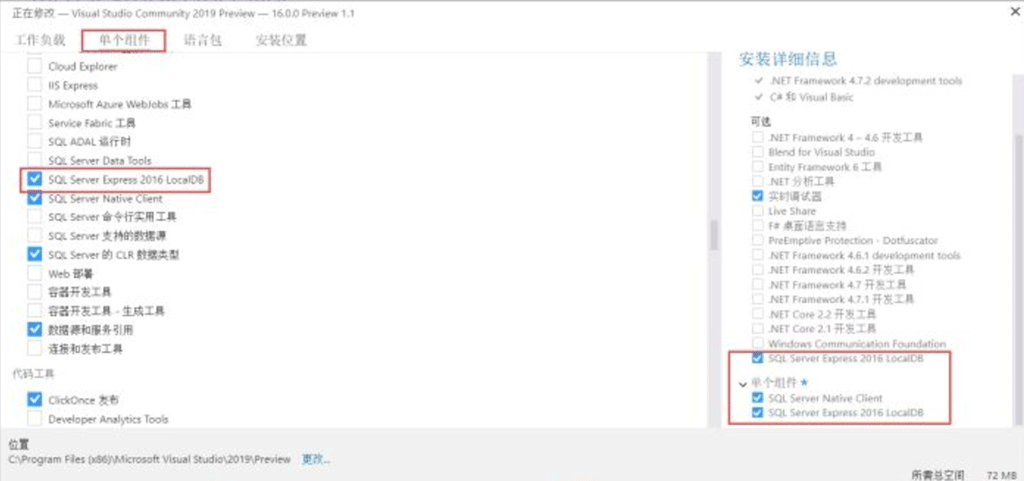 如果選了.NET負(fù)載,直接在里面勾上就行;如果沒有,選到單個組件,勾上localdb,會自動勾上下一項(xiàng)那個依賴。