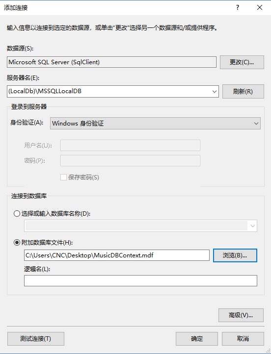 然后附加一個名稱為MusicDBContext.mdf的數(shù)據(jù)庫文件(文件可以自己定義)并點(diǎn)擊確定,此時,MusicDBContext.數(shù)據(jù)庫作為默認(rèn)的數(shù)據(jù)庫,我們可以選擇SQLLocalDB中的其他已有數(shù)據(jù)庫。