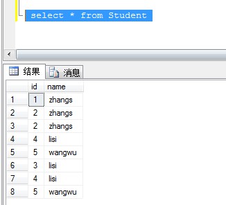 create table Student(ID varchar(10) not null,Name varchar(10) not null,);insert into Student values("1", "zhangs");insert into Student values("2", "zhangs");insert into Student values("3", "lisi");insert into Student values("4", "lisi");insert into Student values("5", "wangwu");