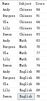 有一張學生表,分別name,學科,分數 這三個字段,如下: