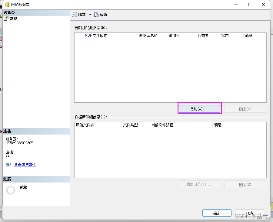 注意: 附加數據庫時,該數據庫必須已分離且所有數據文件(MDF 文件或 NDF 文件)都必須可用;