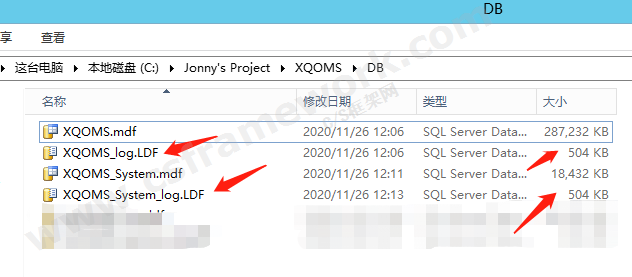 附加數據庫文件成后,查閱本地數據庫文件,發現重新生成的日志文件為504KB。
