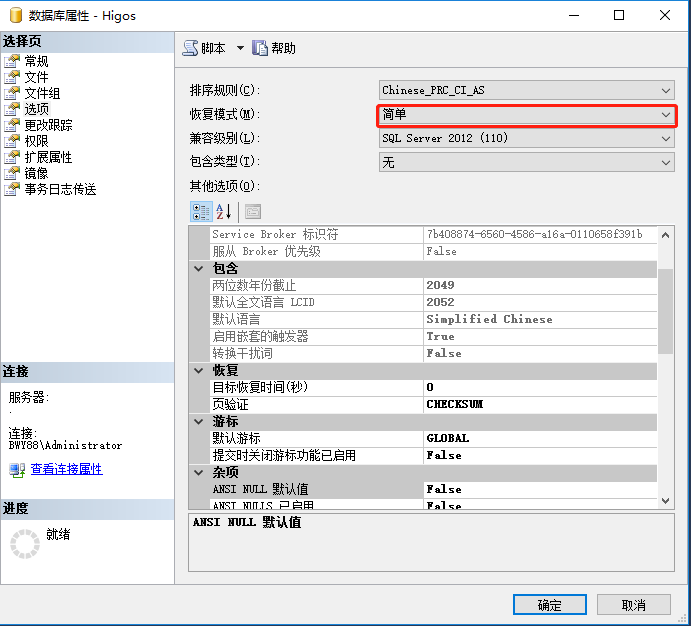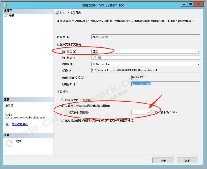 分兩步操作:step 1.操作步驟:在數據庫右鍵 --> 數據庫屬性 -->選項 -->將數據庫【恢復模式】修改為【簡單】。點確定按鈕。