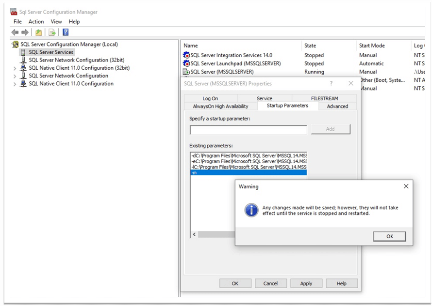 為此,請打開“SQL Server 配置管理器”,選擇“SQL Server 服務”,然后選擇相應的 SQL Server 實例,右鍵單擊它并選擇“啟動參數”。作為啟動參數,我們指定“-m”,表示服務將以單用戶模式啟動。