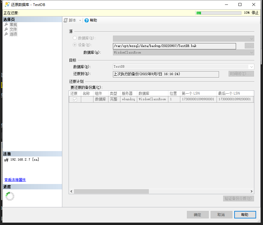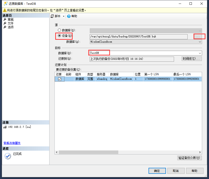 - 首先 "源" 選擇設(shè)備,并且選擇到完整備份的數(shù)據(jù)庫(kù)備份文件