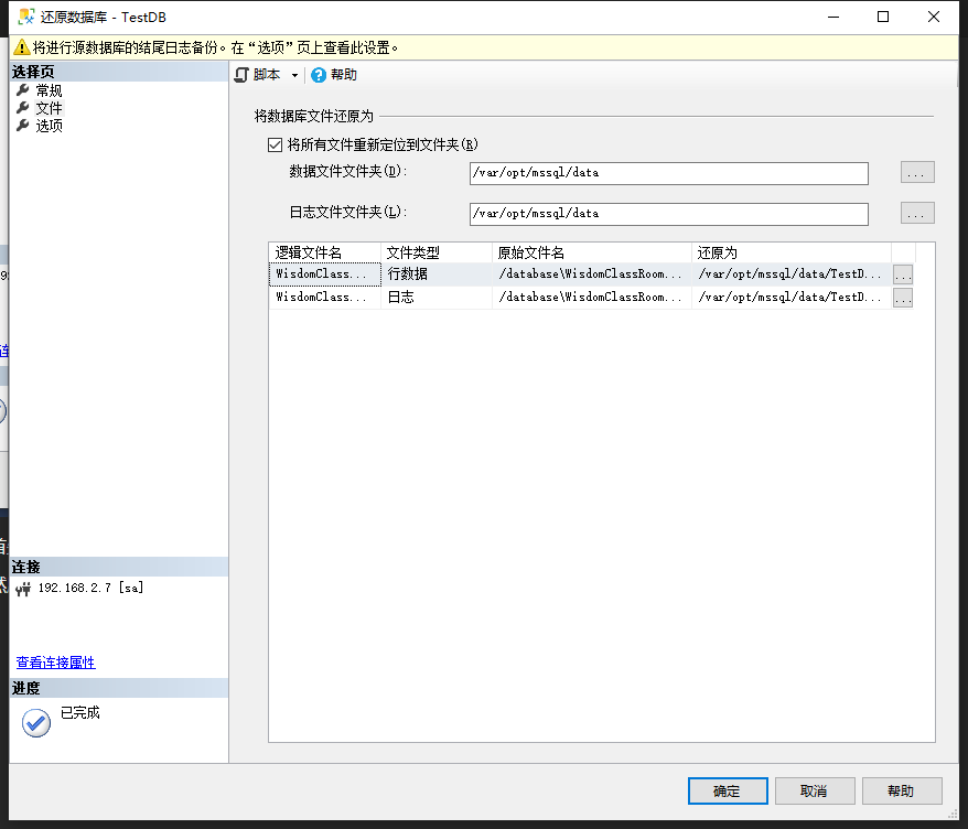 建議勾選選項(xiàng)"將所有文件重新定位到文件夾",其實(shí)就是還原以后的數(shù)據(jù)庫(kù)保存位置,當(dāng)然不勾也一樣能還原。