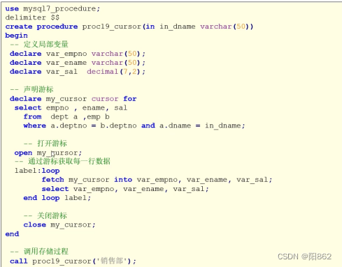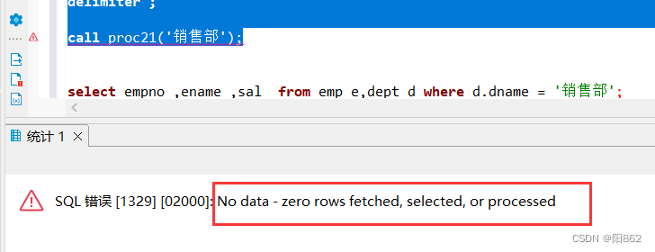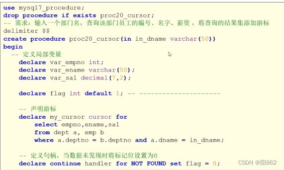 use test_procedure ;-- 需求:輸入一個部門名,查詢該部門員工的編號、名字、薪資,將查詢的結(jié)果集添加游標delimiter $$create procedure proc21(in in_name varchar(50))begin -- 定義局部變量 declare var_empno int; declare var_ename varchar(50); declare var_sal decimal(7,2); -- 聲明游標 declare my_cursor cursor for select empno ,ename ,sal from emp e,dept d where d.dname =in_name ; -- 打開游標 open my_cursor; -- 通過游標獲得值 label:loop fetch my_cursor into var_empno,var_ename,var_sal; select var_empno,var_ename,var_sal; end loop label; -- 關閉游標 close my_cursor;end $$delimiter ; call proc21("銷售部");結(jié)果會報錯
