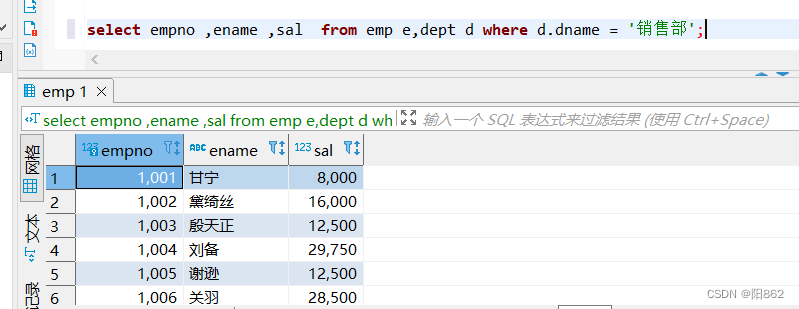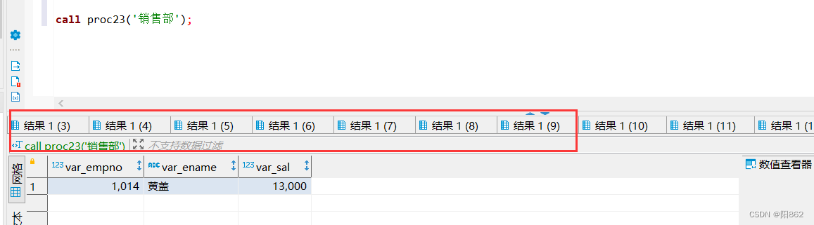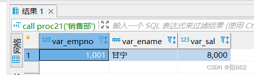 use test_procedure ;-- 需求:輸入一個部門名,查詢該部門員工的編號、名字、薪資,將查詢的結(jié)果集添加游標delimiter $$create procedure proc21(in in_name varchar(50))begin -- 定義局部變量 declare var_empno int; declare var_ename varchar(50); declare var_sal decimal(7,2); -- 聲明游標 declare my_cursor cursor for select empno ,ename ,sal from emp e,dept d where d.dname =in_name ; -- 打開游標 open my_cursor; -- 通過游標獲得值 fetch my_cursor into var_empno,var_ename,var_sal; select var_empno,var_ename,var_sal; -- 關閉游標 close my_cursor;end $$delimiter ; call proc21("銷售部");運行輸出的結(jié)果是