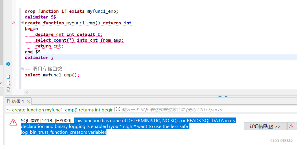 意思是說“此函數(shù)在其聲明中沒有確定性、無 SQL 或讀取 SQL 數(shù)據(jù),并且啟用了二進制日志記錄(您*可能*希望使用不太安全的 log_bin_trust_function_creators 變量)”