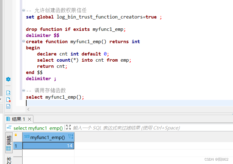 -- 允許創(chuàng)建函數(shù)權(quán)限信任set global log_bin_trust_function_creators=true ; drop function if exists myfunc1_emp;delimiter $$create function myfunc1_emp() returns intbegin declare cnt int default 0; select count(*) into cnt from emp; return cnt;end $$delimiter ; -- 調(diào)用存儲函數(shù)select myfunc1_emp();