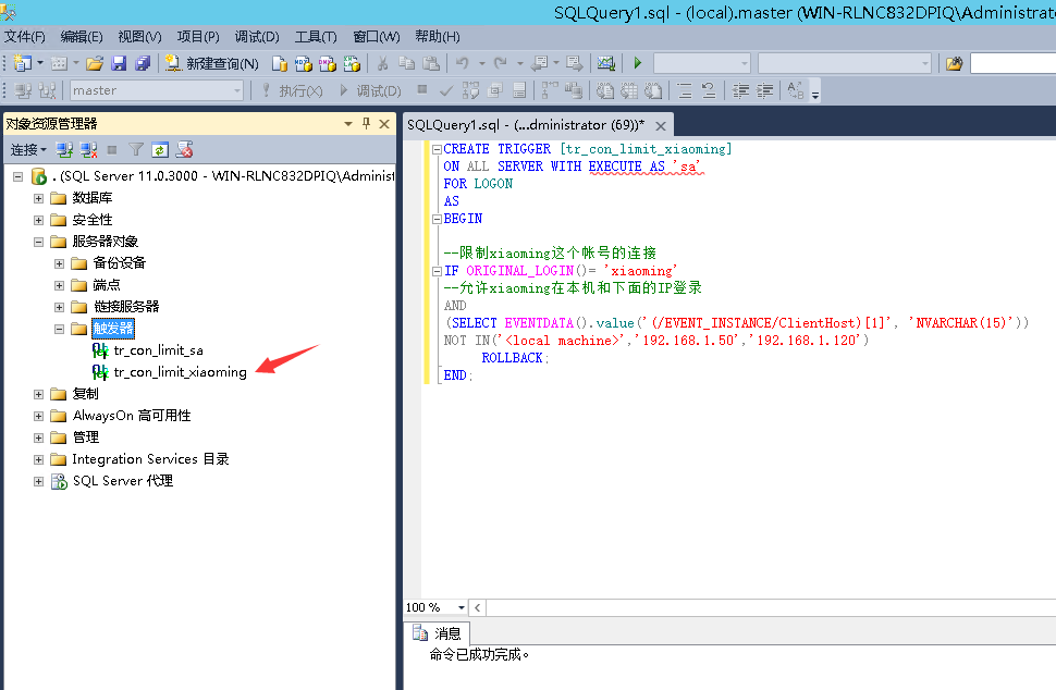 CREATE TRIGGER [tr_con_limit_xiaoming]ON ALL SERVER WITH EXECUTE AS "sa"FOR LOGONASBEGIN--限制xiaoming這個帳號的連接IF ORIGINAL_LOGIN()= "xiaoming"--允許xiaoming在本機和下面的IP登錄AND(SELECT EVENTDATA().value("(/EVENT_INSTANCE/ClientHost)[1]", "NVARCHAR(15)"))NOT IN("","192.168.1.2","192.168.1.3") ROLLBACK;END;執(zhí)行之后就會創(chuàng)建一個叫做 tr_con_limit_xiaoming 的觸發(fā)器,如下圖