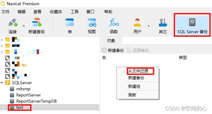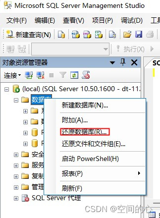選擇SqlServer任意數據庫→SQL Server備份→空白處鼠標右鍵→選擇從文件還原