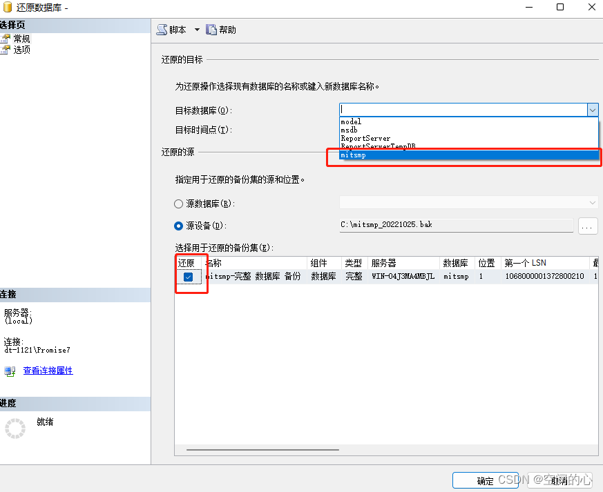 勾選用于還原的備份集→這時目標數據庫中會自動生成目標數據庫名,在此選擇即可→確定