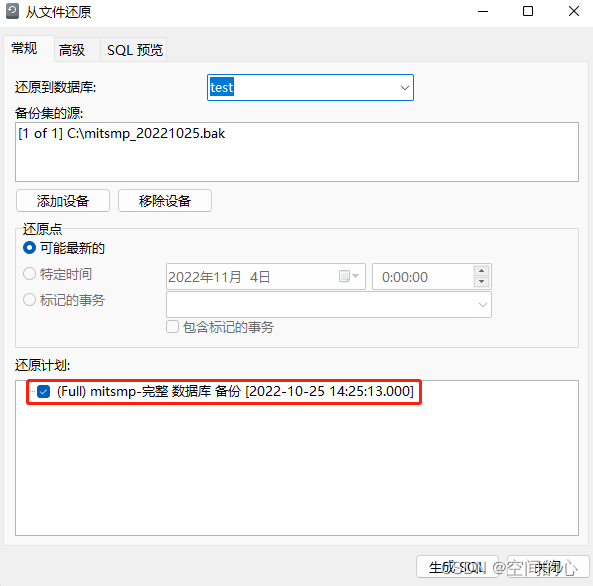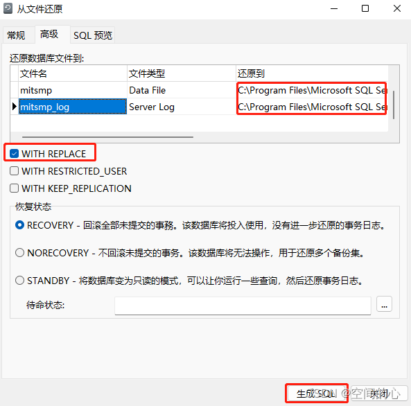 選擇高級→勾選WITH REPLACE→選擇數據文件和日志文件存放位置(這里不選擇會默認放置在之前服務器/電腦的地址)→生成SQL