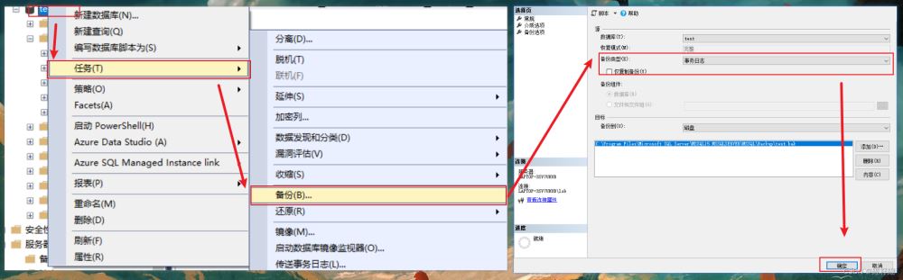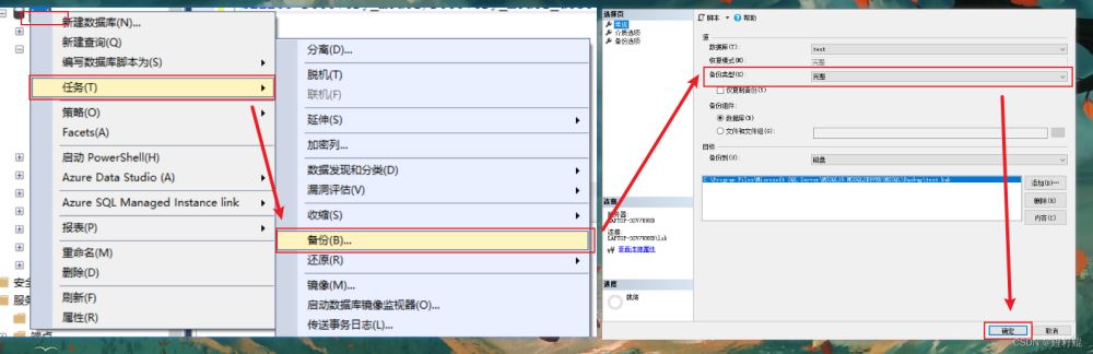 選中數據庫=》右鍵菜單,選擇【任務】=》選擇【備份】=》備份類型,選擇【完整】=》確定