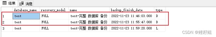 如:本人剛才操作了兩次數據完整備份和一次事務日志備份,查詢結果如下,