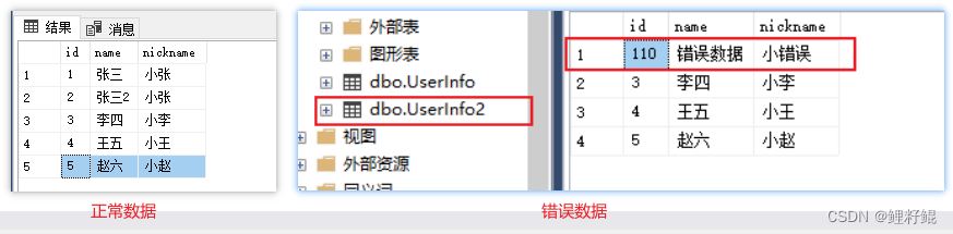 --模擬誤操作 2022-11-23 14.25 開始的誤操作,記一下誤操作事件,以便后續演示數據恢復--本意刪除張三2的,但是條件不當,將不該刪除的數據也刪除了delete from UserInfo where nickname="小張";insert into UserInfo values (110,"錯誤數據","小錯誤");--不小心新建了一個表格select * into UserInfo2 from UserInfo;