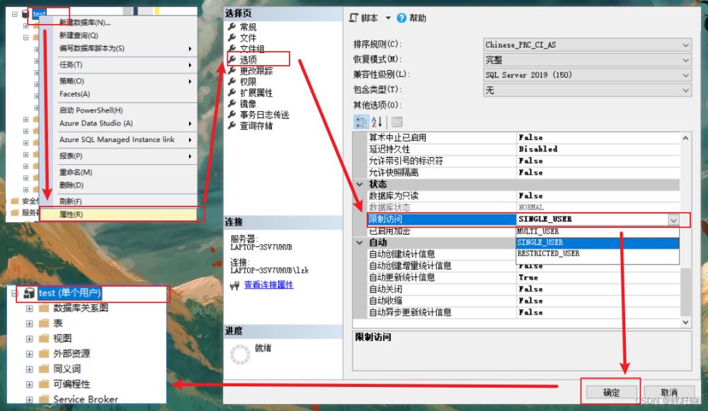 出現誤操作后,我們需要切斷其他用戶對數據庫在進行操作產生數據,造成更大的問題,因此需要先將數據庫限制為單個用戶訪問,與外界隔絕開。