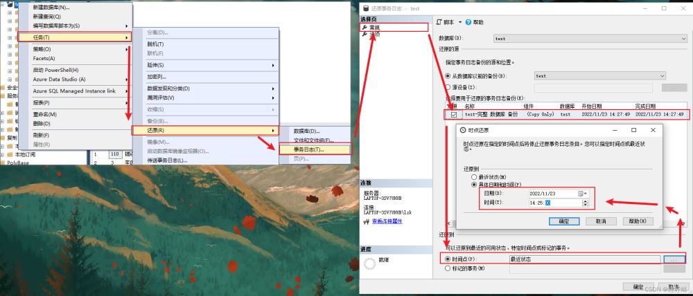 - 12:05 我們發現自己誤操作了,馬上設置訪問權限,進行事務日志備份(這很關鍵),此時我們就有了2022-10-11所有的完整數據,以及到2022-10-12 12:05所有的事務日志。那么我們就可以根據2022-10-11的完整數據以及2022-10-12 12:05 的事務日志去反推12:00的數據。因此我們需要做的第一個操作先還原2022-10-11的完整數據備份,然后還原2022-10-12 12:05事務日志備份,并且設置還原的時間點。最后數據庫系統會根據完整數據以及事務日志備份和設置的還原時間點去恢復數據。