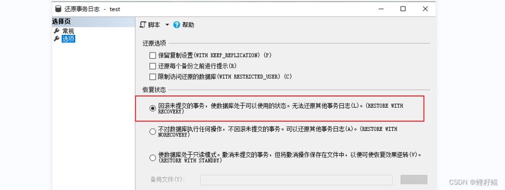 - 設置完還原的時間點后,在【選項】這一項設置中,設置恢復狀態為回滾未提供事務,使用數據庫處于可以使用的狀態