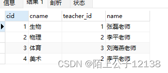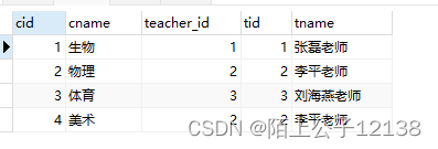 ?select * from course c where c.teacher_id="1"; select * from teacher t where t.tid="1"; ??-- 最后拼接select * ,(select tname from teacher t where t.tid=c.teacher_id)name from course c;