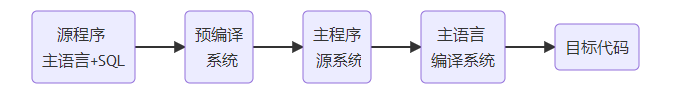 對于嵌入式SQL, DBMS一般采用預編譯的方法,即由DBMS的預處理程序?qū)υ闯绦蜻M行掃描識別出SQL語句,并把它們轉(zhuǎn)換成主語言中相應的調(diào)用語句,成為主語言源程序,以使主語言編譯程序能夠識別它們,最后由主語言的編譯程序?qū)⑺幾g成目標代碼,如下圖所示。