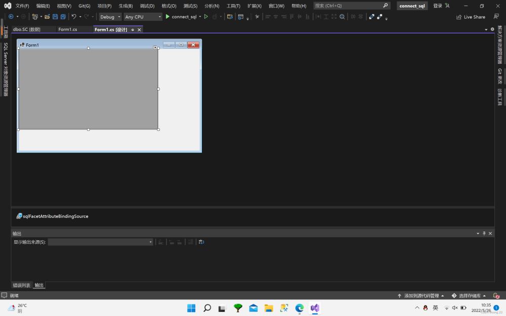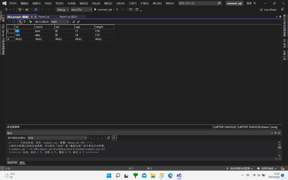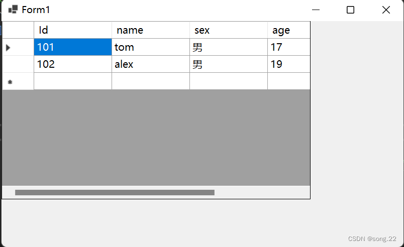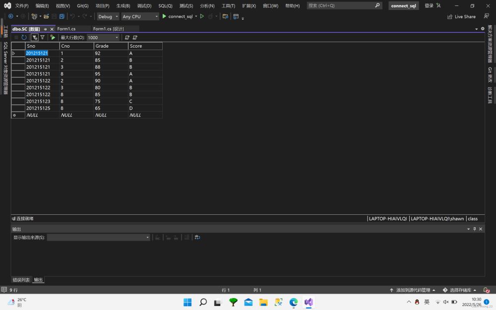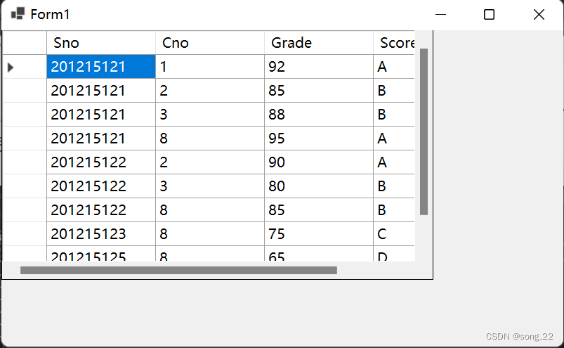 using System.Data;using System.Data.SqlClient;namespace connect_sql{ public partial class Form1 : Form {public Form1(){ InitializeComponent(); Table();} //數(shù)據(jù)寫(xiě)入,公共的,所有有表格的地方都用的上 public void Table() { SqlConnection sqlcon = new SqlConnection(); sqlcon.ConnectionString = "Data Source=LAPTOP-HIAIVLQI;Initial Catalog=class;Integrated Security=True"; sqlcon.Open(); dataGridView1.Rows.Clear(); string sql = "select * from sc"; SqlCommand com = new SqlCommand(sql, sqlcon); SqlDataAdapter ada = new SqlDataAdapter(sql, sqlcon);//建立SQL語(yǔ)句與數(shù)據(jù)庫(kù)的連接 DataSet ds = new DataSet(); //實(shí)例化Datatable類(lèi) ada.Fill(ds); //添加SQL并且執(zhí)行 dataGridView1.DataSource = ds.Tables[0].DefaultView;//顯示數(shù)據(jù) } }}運(yùn)行程序,F(xiàn)orm1窗體中已通過(guò)dataGridView顯示數(shù)據(jù),且數(shù)據(jù)與源數(shù)據(jù)無(wú)誤。