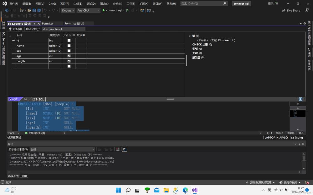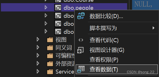 public void Table() { SqlConnection sqlcon = new SqlConnection(); sqlcon.ConnectionString = "Data Source=LAPTOP-HIAIVLQI;Initial Catalog=song;Integrated Security=True";//連接服務(wù)器 sqlcon.Open(); dataGridView1.Rows.Clear(); string sql = "select * from people";//SQL語(yǔ)句,可自己編寫(xiě)需要的。 SqlCommand com = new SqlCommand(sql, sqlcon); SqlDataAdapter ada = new SqlDataAdapter(sql, sqlcon);//建立SQL語(yǔ)句與數(shù)據(jù)庫(kù)的連接 DataSet ds = new DataSet(); //實(shí)例化Datatable類(lèi) ada.Fill(ds); //添加SQL并且執(zhí)行 dataGridView1.DataSource = ds.Tables[0].DefaultView;//顯示數(shù)據(jù) }那么以上就是VS連接SQL Server 數(shù)據(jù)庫(kù)一些基本操作。