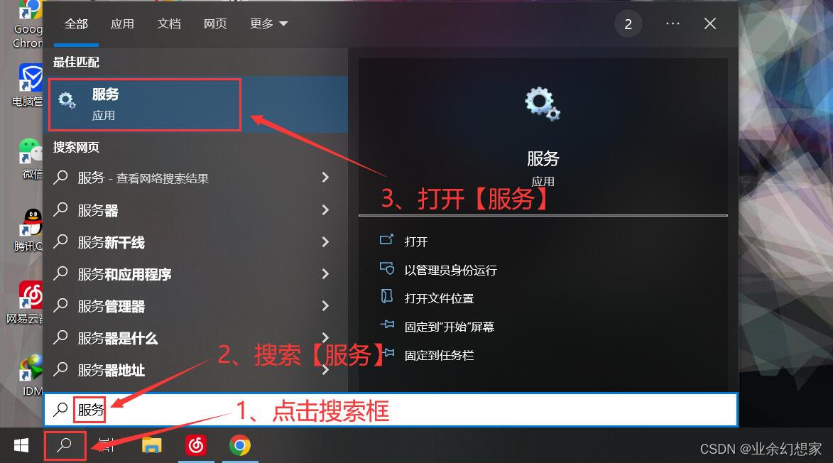 首先要把 SQL Server 的服務都關掉,通過 Windows 最下面搜索框搜索 【服務】 并打開(或者同時按住 Win + R 鍵,在彈出的運行框里面輸入【services.msc】命令也可以進入到【服務】)