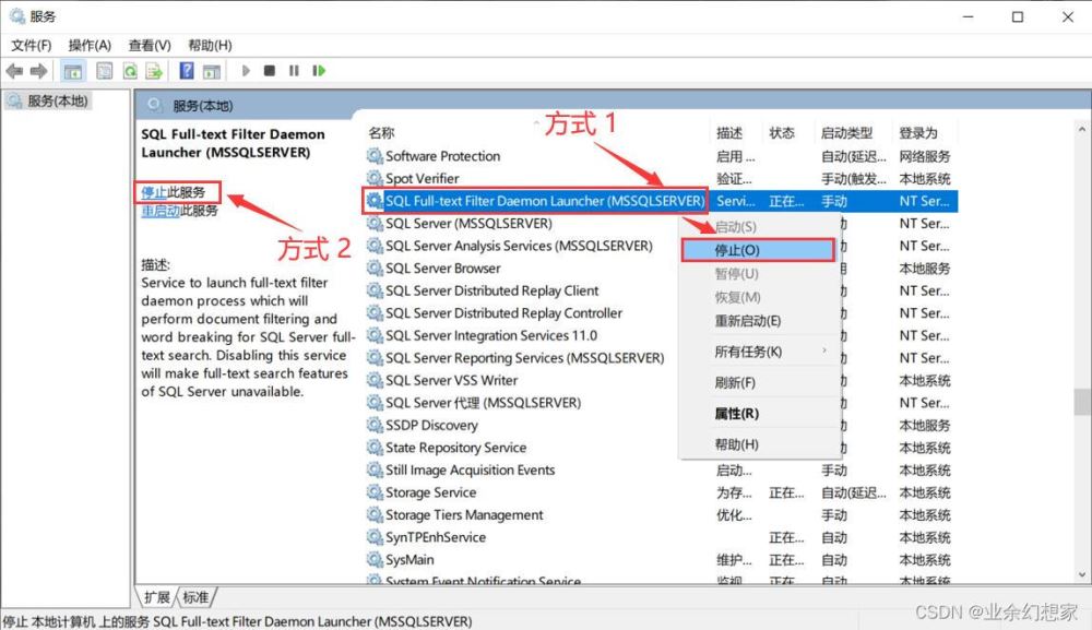 鼠標【右鍵】-【停止】或 直接點擊左邊的【停止】,兩種方式任選一種停止服務就行(后面需要刪除 SQL Server 的文件夾,如果刪除不成功就是 SQL Server 的服務沒關掉)