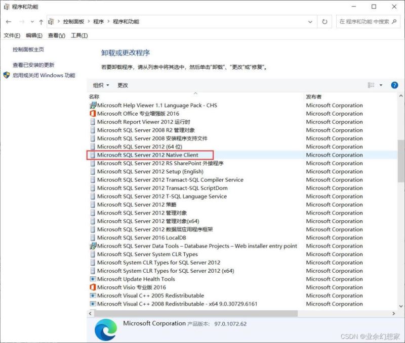 找到 Microsoft SQL Server 2012 Native Client 鼠標【右鍵】-【卸載】,在彈出的對話框中選擇【是】(其他版本找對應的 Native Client 程序,如:SQL Server 2019 就找 Microsoft SQL Server 2019 Native Client)