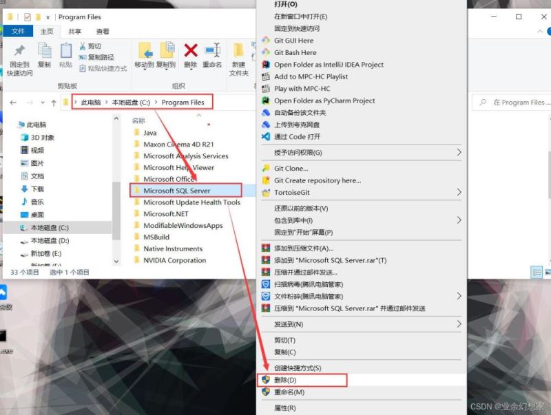 找到自己的之前安裝 Microsoft SQL Server 的目錄(默認安裝的在 C 盤)鼠標【右鍵】-【刪除】,然后進入C:\Program Files 文件夾下,找到 Microsoft SQL Server 文件夾 鼠標【右鍵】-【刪除】