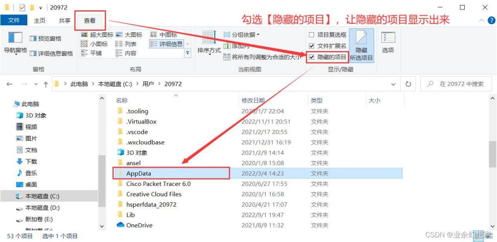 注:因為 AppData 是一個隱藏的文件,所以需要顯示隱藏的項目,就按照下面的操作就可以找到了