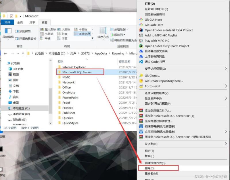 進入 C:\Users\20972\AppData\Roaming\Microsoft 文件夾下(就是 C:\用戶\你自己電腦的用戶名\AppData\Roaming\Microsoft,這里我的用戶名叫20972),找到 Microsoft SQL Server 文件夾 鼠標【右鍵】-【刪除】