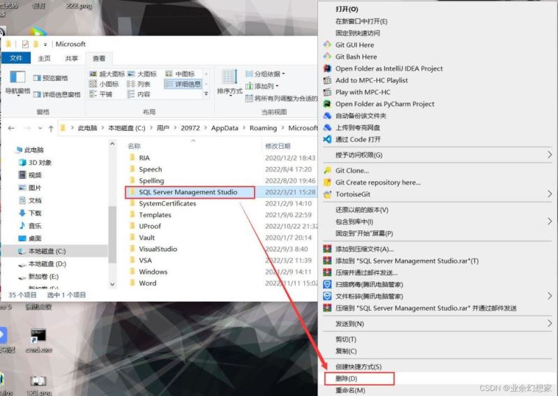 在 C:\Users\20972\AppData\Roaming\Microsoft 文件夾下(就是剛剛這個文件夾下),找到 SQL Server Management Studio 文件夾 鼠標【右鍵】-【刪除】