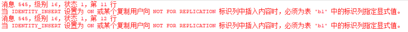 set identity_insert b1 off --關閉對標識列的插入操作,標識列不允許手動插入顯示值