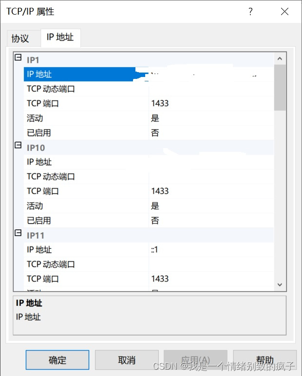 6.打開SQL Server網(wǎng)絡(luò)配置,打開Tcp/IP協(xié)議,進(jìn)去查看SQL Server端口號(hào),到此數(shù)據(jù)庫配置完成