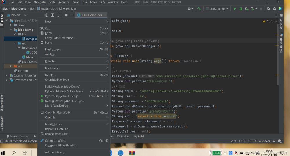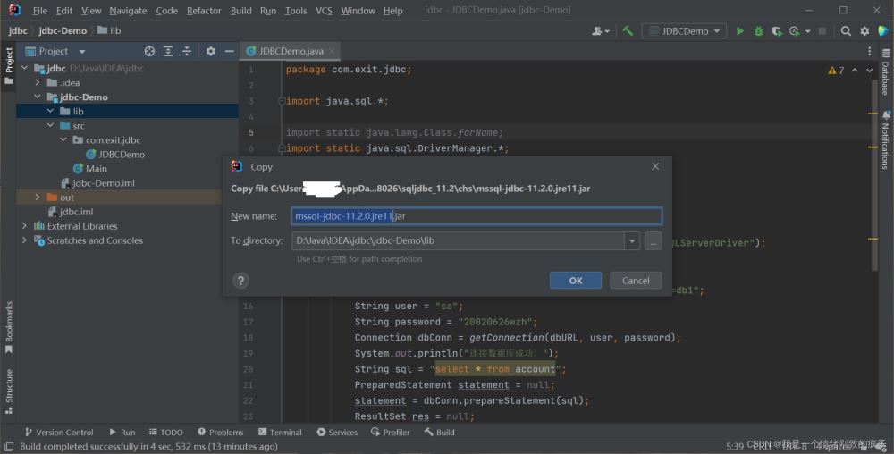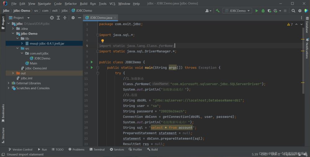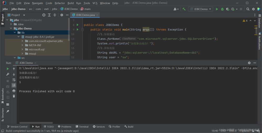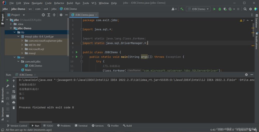 package com.exit.jdbc; import java.sql.*; import static java.lang.Class.forName;import static java.sql.DriverManager.*; public class JDBCDemo { public static void main(String args[]) throws Exception {//1.加載驅(qū)動(dòng)Class.forName("com.microsoft.sqlserver.jdbc.SQLServerDriver");System.out.println("加載驅(qū)動(dòng)成功!");//2.獲取連接String dbURL = "jdbc:sqlserver://localhost;DatabaseName=db1";//DatabaseName=跟上要連接的數(shù)據(jù)庫名稱,我要連接db1數(shù)據(jù)庫,所以DatabaseName=db1String user = "sa";String password = "123456";//在引號(hào)中修改為自己設(shè)置的密碼Connection conn = getConnection(dbURL, user, password);System.out.println("連接數(shù)據(jù)庫成功!");//3.定義SQL語句String sql = "update account set money=2000 where id="1"";//4.獲取執(zhí)行SQL的對(duì)象Statement stmt = conn.createStatement();//5.執(zhí)行SQL語句int count = stmt.executeUpdate(sql);//6.處理結(jié)果,打印出受影響的行數(shù)System.out.println(count);//7.釋放資源stmt.close();conn.close(); }}運(yùn)行結(jié)果