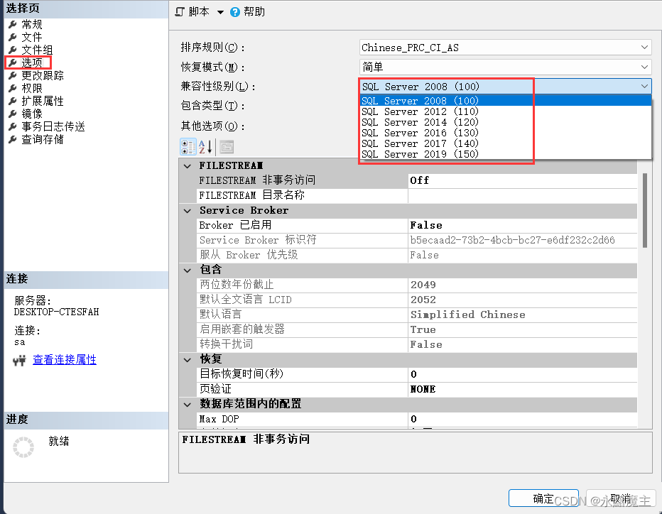 (2)查看版本號,及兼容信息。右鍵任意一個創建好的數據庫,選擇屬性,在選擇頁中,點擊選項,就可以看到右邊列表頁中的兼容級別下拉列表。