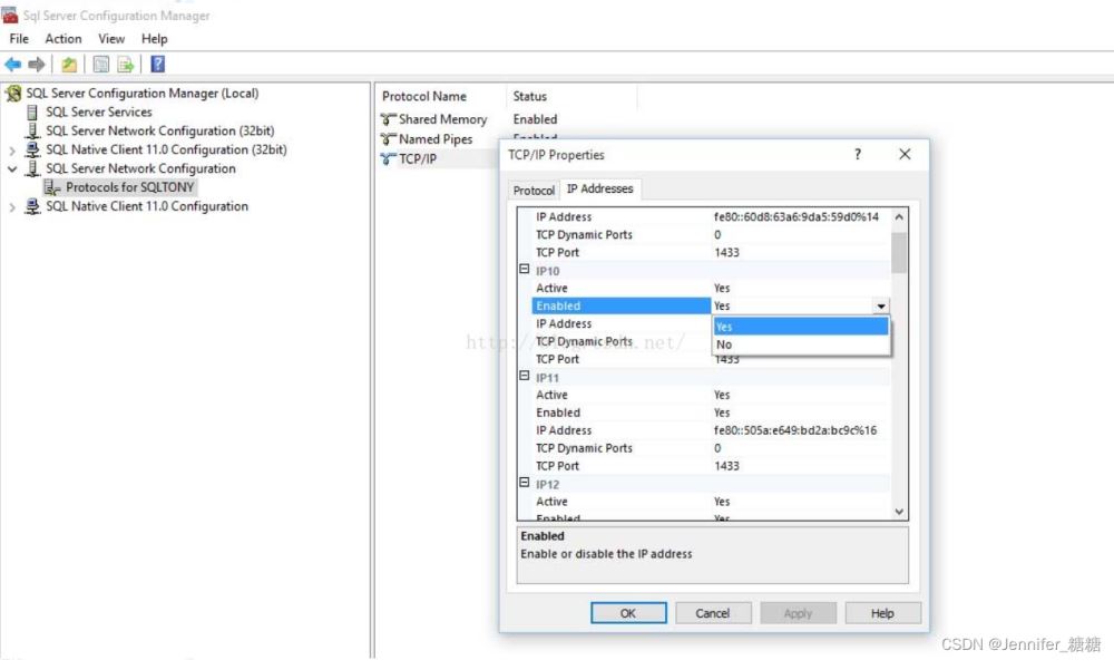 1、打開配置管理器,檢查微軟SQL服務器(MSSQLServer)的TCP/IP協議是否開啟。