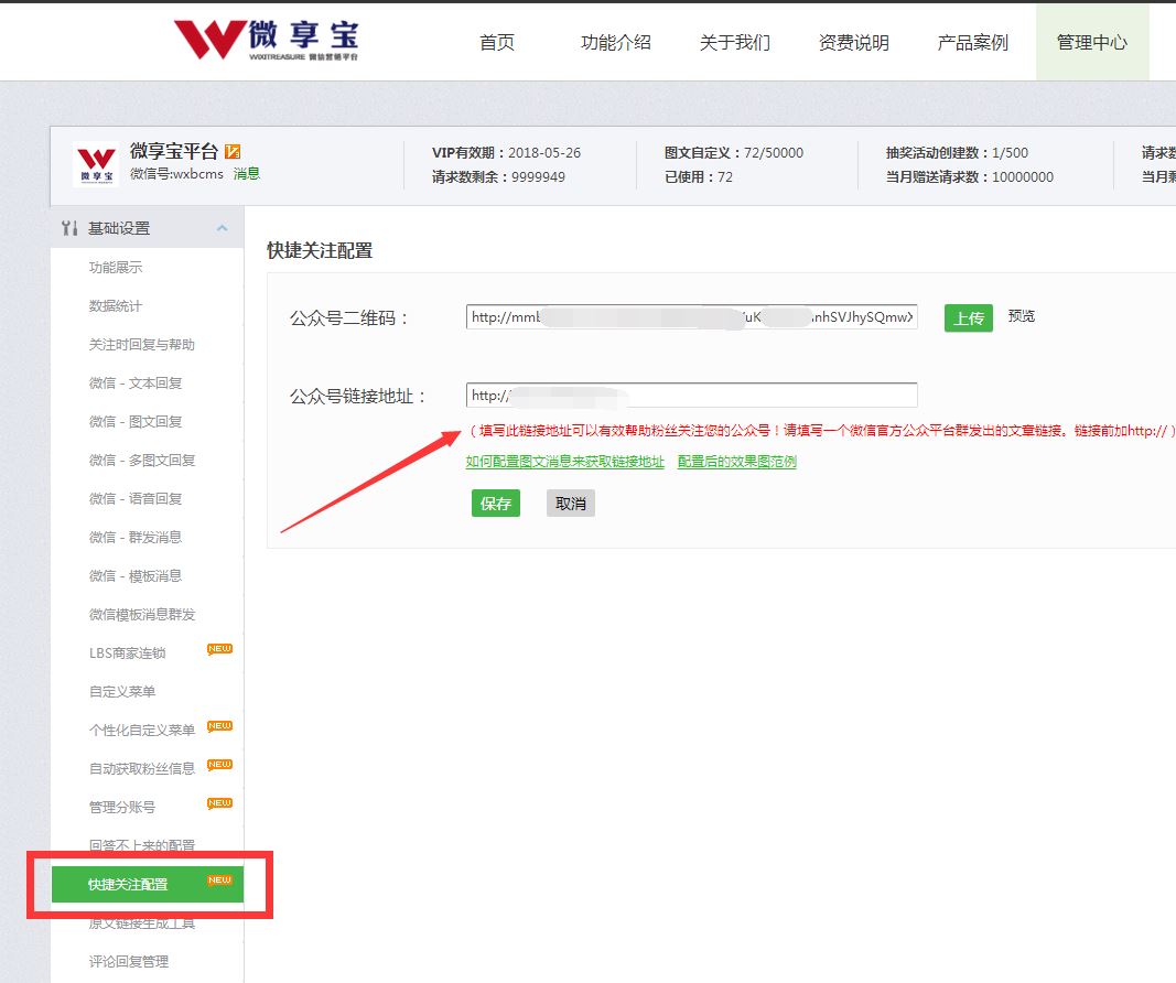 2.在左側基礎設置里面找到自動獲取粉絲信息,選擇獲取頭像昵稱,開啟,保存。然后找到快捷關注配置,把群發過的那篇圖文鏈接粘貼上去,保存。