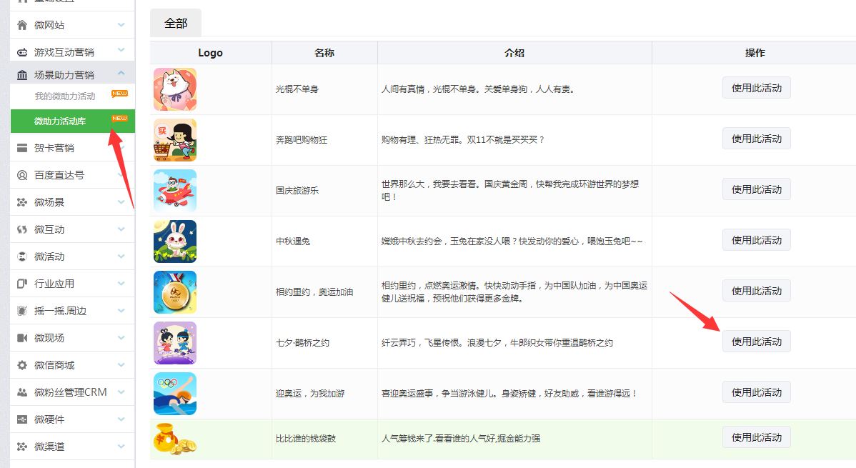 3.接著在左邊目錄里,點擊場景助力營銷,點擊游戲庫,通過搜索或者翻頁的方式找到這情人節的助力游戲-七夕·鵲橋之約,選擇一個點擊我要使用此活動就可以進行編輯了。