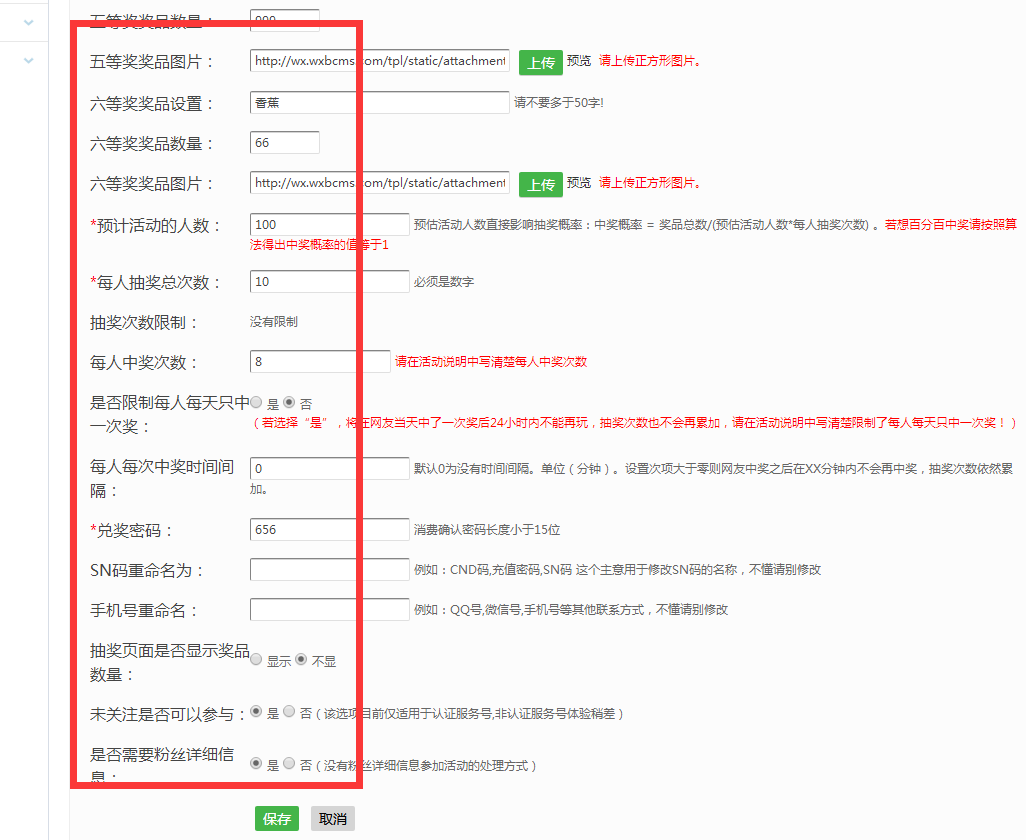 第四步:填寫(xiě)預(yù)計(jì)參與人數(shù)這一欄的時(shí)候,注意,不是實(shí)際參與的人數(shù),而是控制中獎(jiǎng)的概率的,中獎(jiǎng)概率 = 獎(jiǎng)品總數(shù)/(預(yù)估活動(dòng)人數(shù)*每人抽獎(jiǎng)次數(shù)) 如果要確保任何時(shí)候都100%中獎(jiǎng)建議設(shè)置為1人參加!如果要確保任何時(shí)候都100%中獎(jiǎng)建議設(shè)置為1人參加,最后設(shè)置必須關(guān)注公眾號(hào)才可以抽獎(jiǎng)