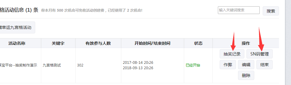 第六步:抽獎(jiǎng)活動(dòng)的數(shù)據(jù)查看,微享寶后臺(tái)抽獎(jiǎng)記錄和SN碼管理,點(diǎn)擊砸獎(jiǎng)記錄進(jìn)去就可以查看所有的參與活動(dòng)的粉絲的具體信息,然后我們可以根據(jù)這個(gè)中獎(jiǎng)的數(shù)據(jù),進(jìn)行發(fā)獎(jiǎng)和標(biāo)記是否已經(jīng)兌獎(jiǎng),還可以把中獎(jiǎng)的記錄導(dǎo)出表格。