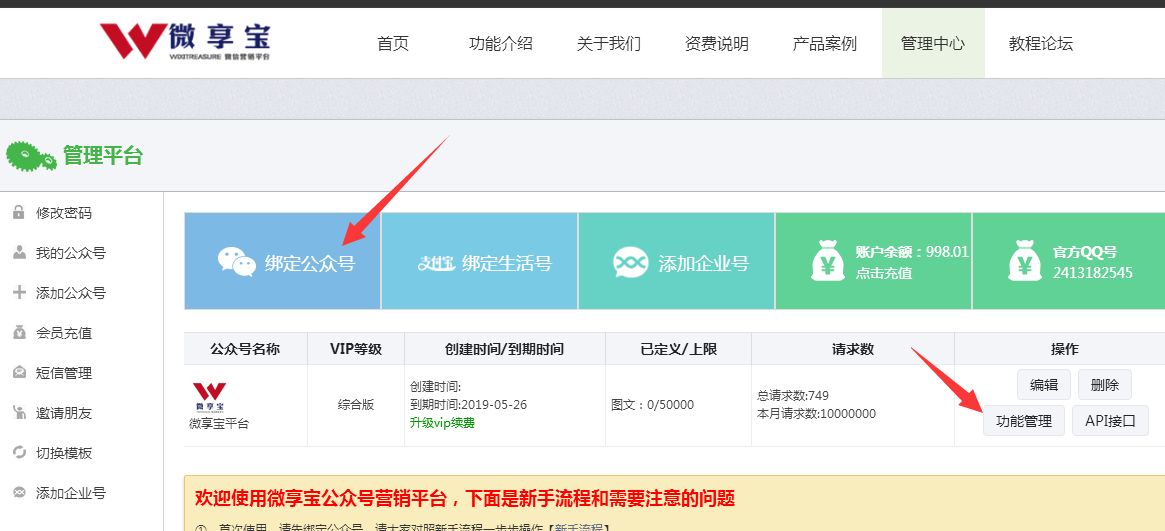第一步:先把微信公眾平臺綁定到微享寶第三方平臺,可以選擇掃碼授權或者是配置API接口,二選一即可。上方綁定公眾號就是掃碼授權的方式接入,左側添加公眾號按鈕就是手動配置API的方式接入,綁定完成以后,點擊功能管理進入后臺.