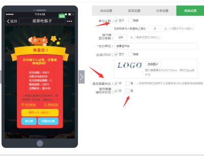 第四步:獎項設置,選擇類型,設置數量,注意兌獎時間的設置要在游戲結束以后,然后切換到高級設置,設置虛擬人數、排行榜顯示數、版權及上傳Logo,關鍵是最后兩項,設置需要關注和設置需要填寫手機號,設置完以后點擊保存,提示設置成功,然后彈窗是否發布.